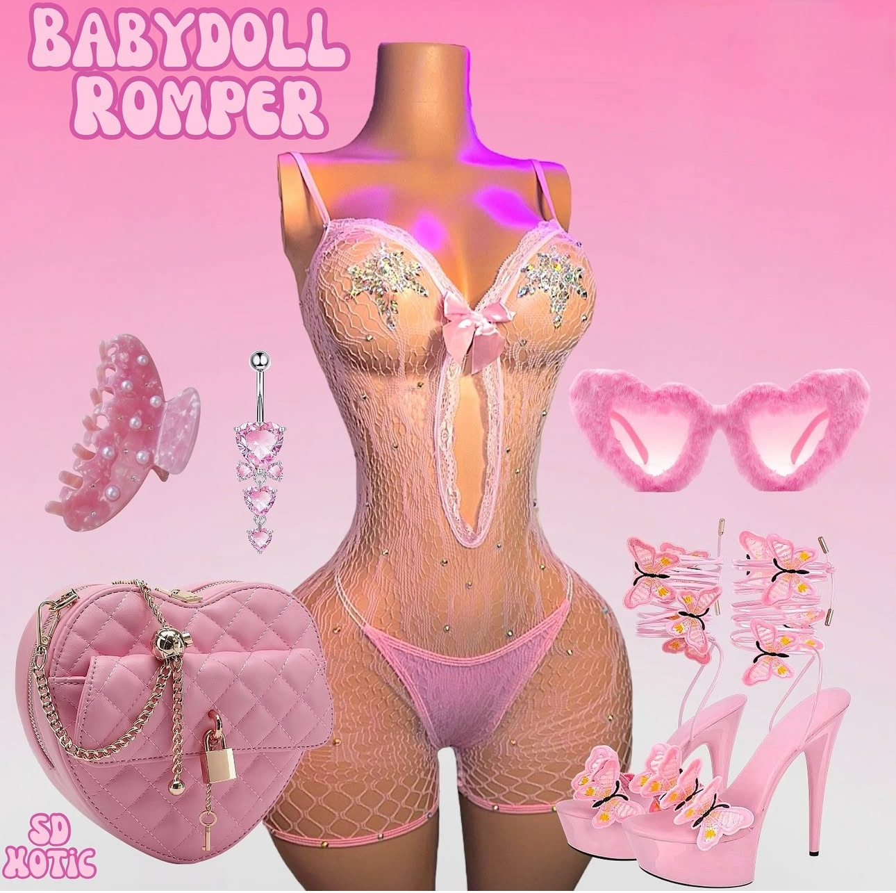 Babydoll Diamond Lace Fishnet Romper Fits XS-L