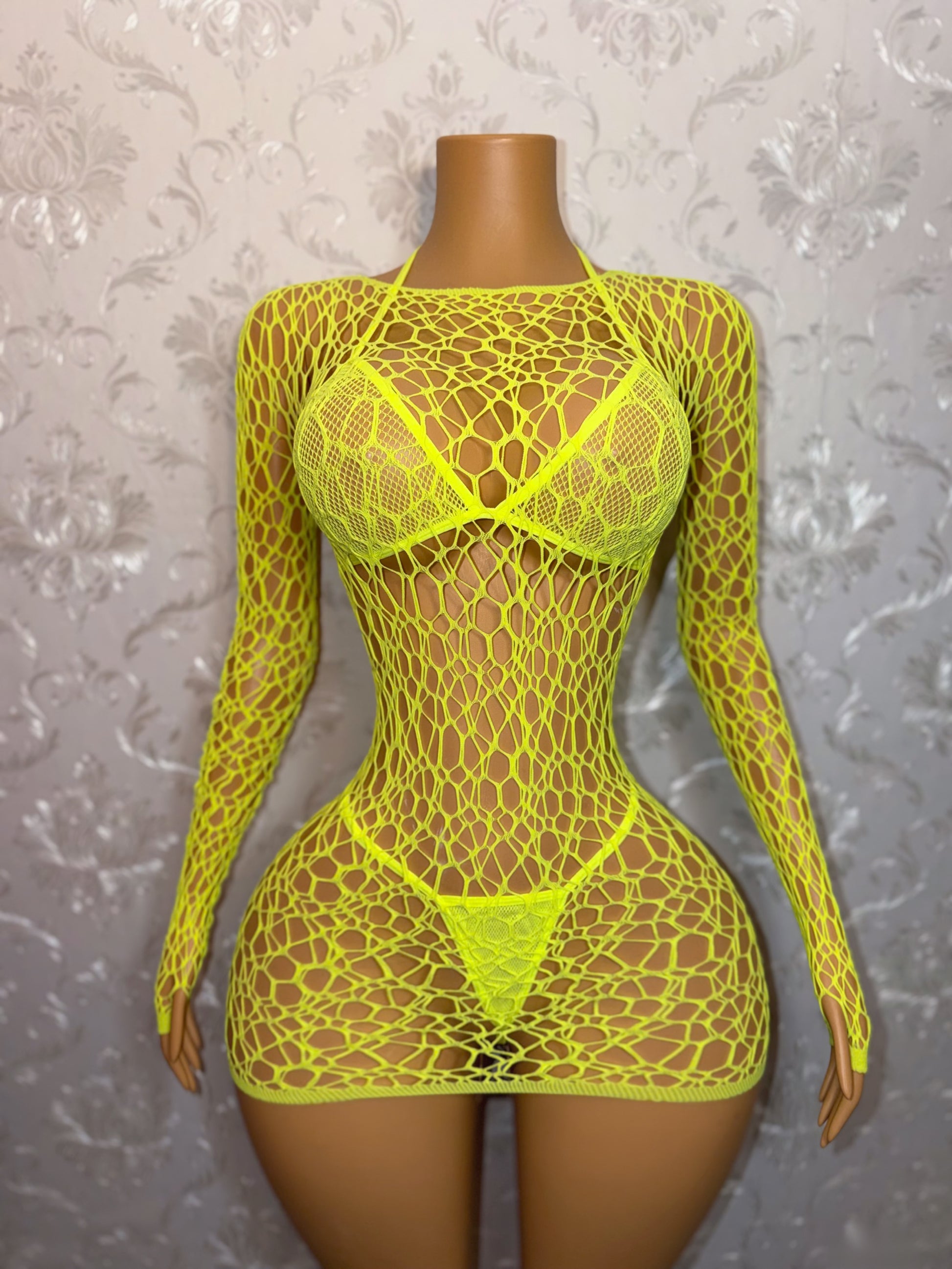 Electra 3 Piece Fishnet Dress and Bikini Set Fits XS-L