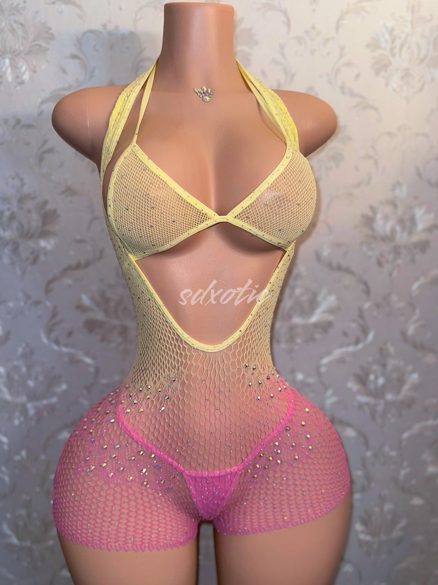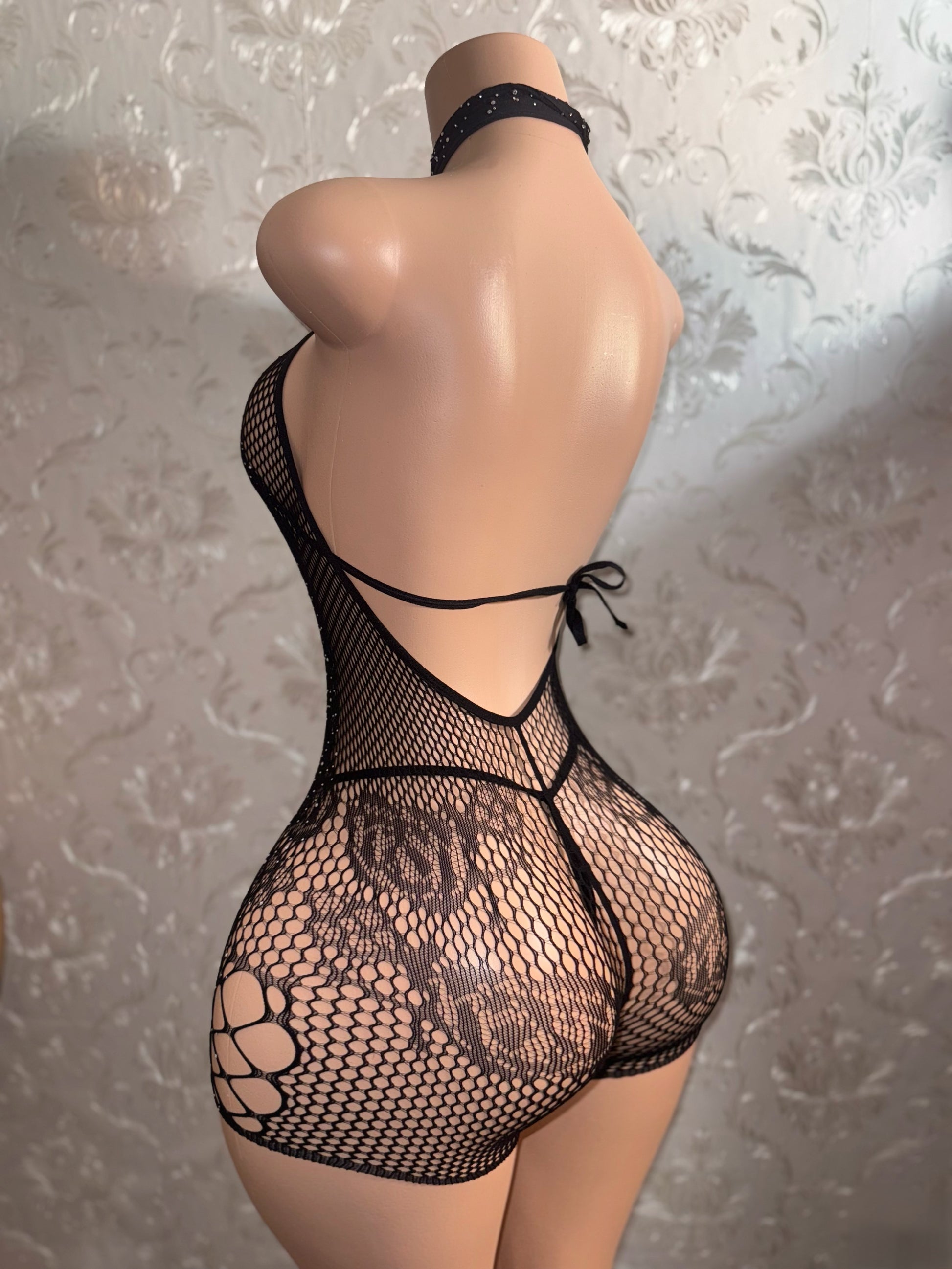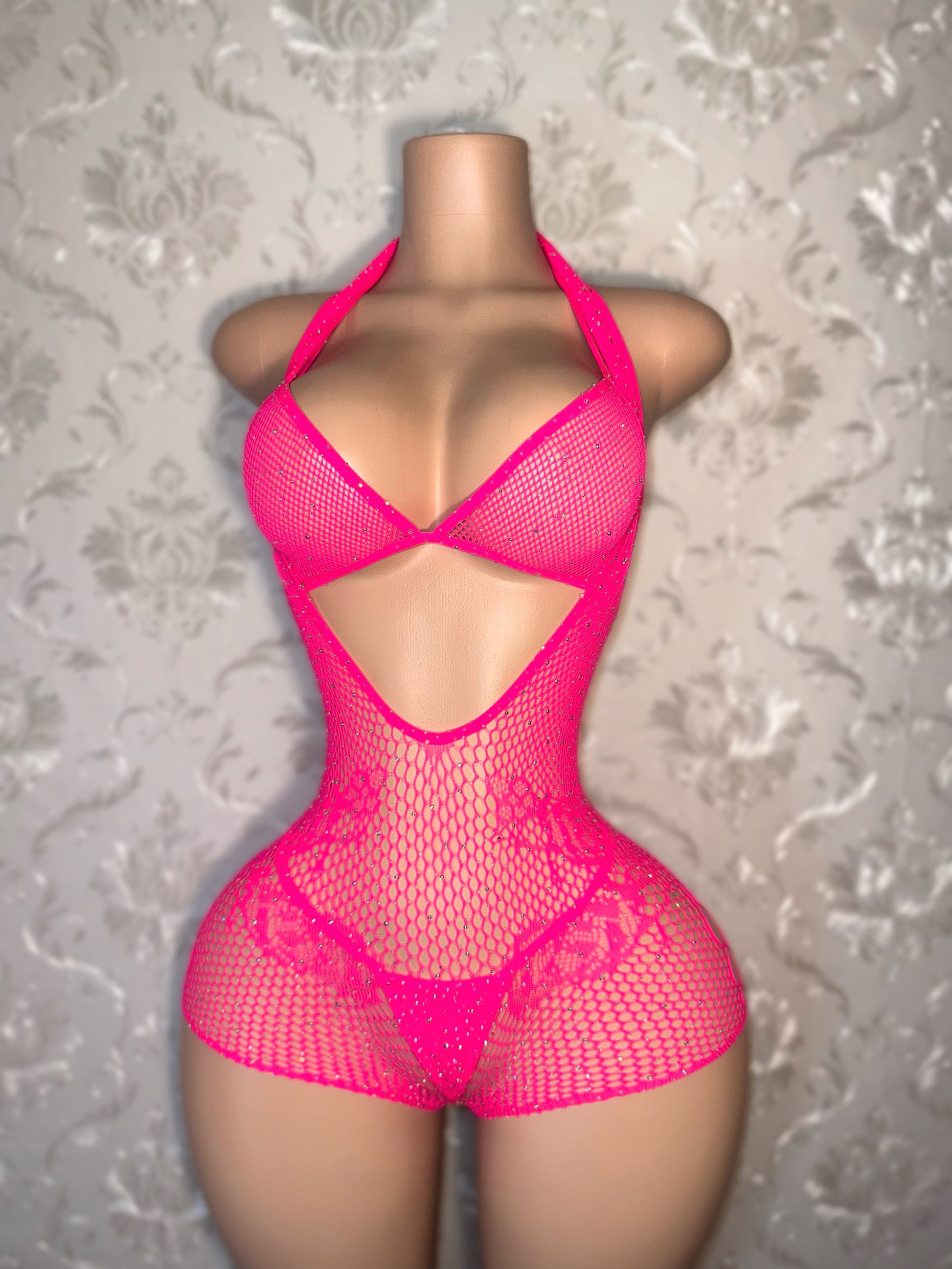 Mean Girl Rhinestone 3 Piece Fishnet Romper Bikini Set
