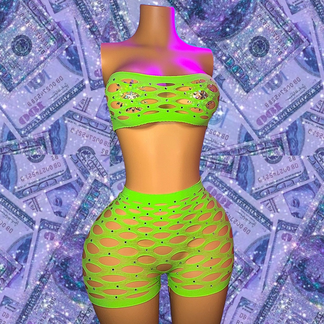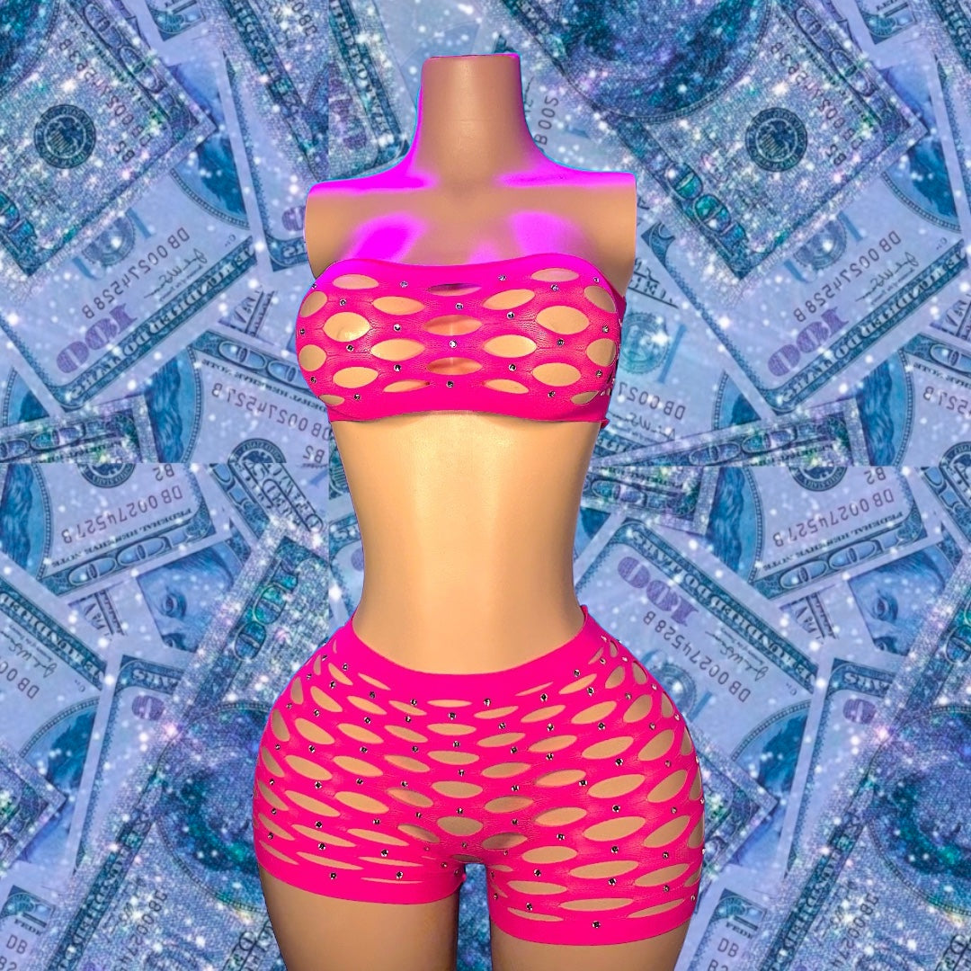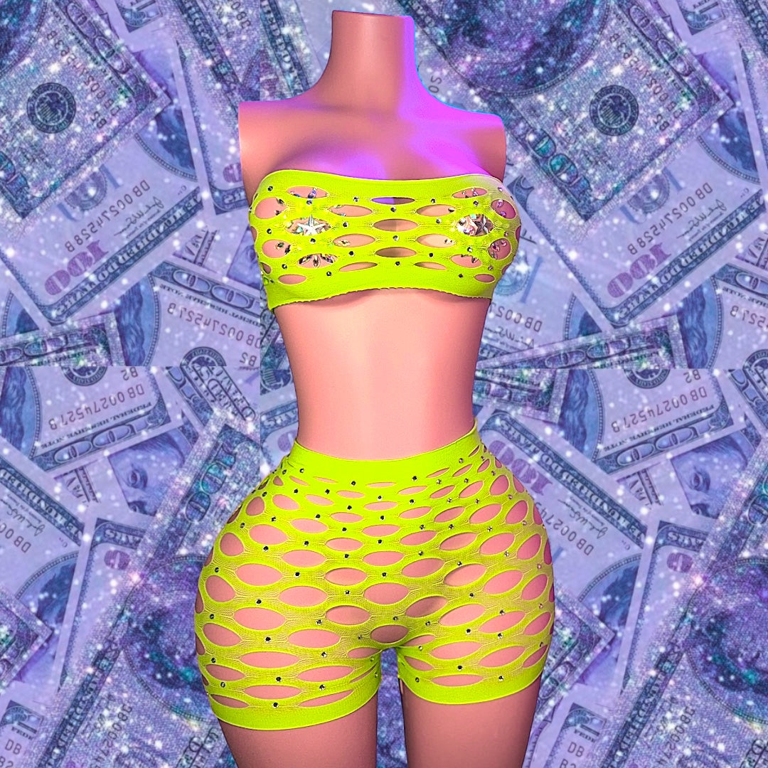 My Type Rhinestone Fishnet Shorts Set Fits XS-L