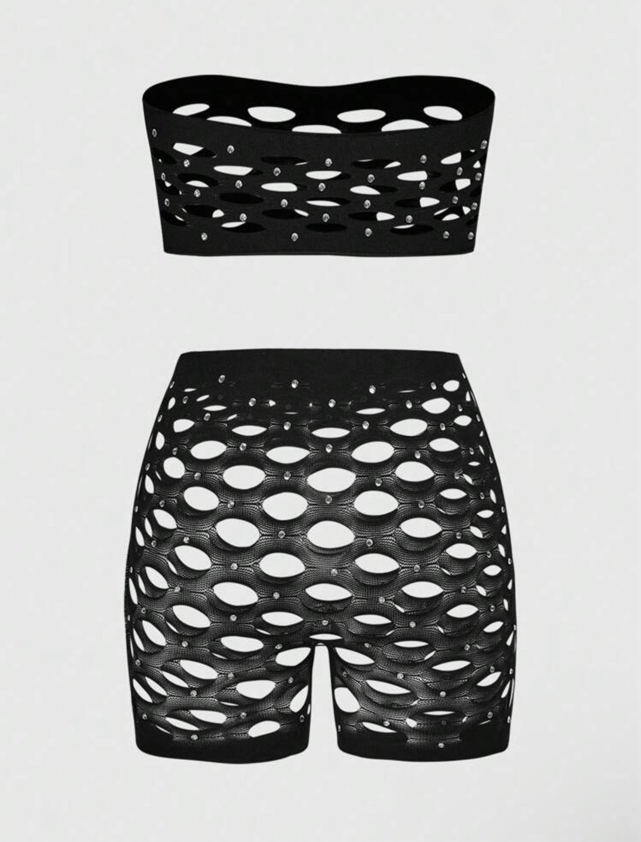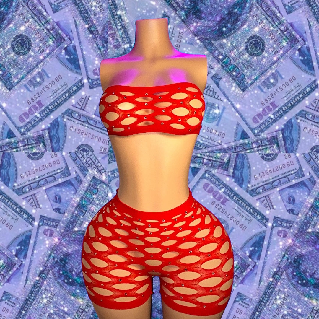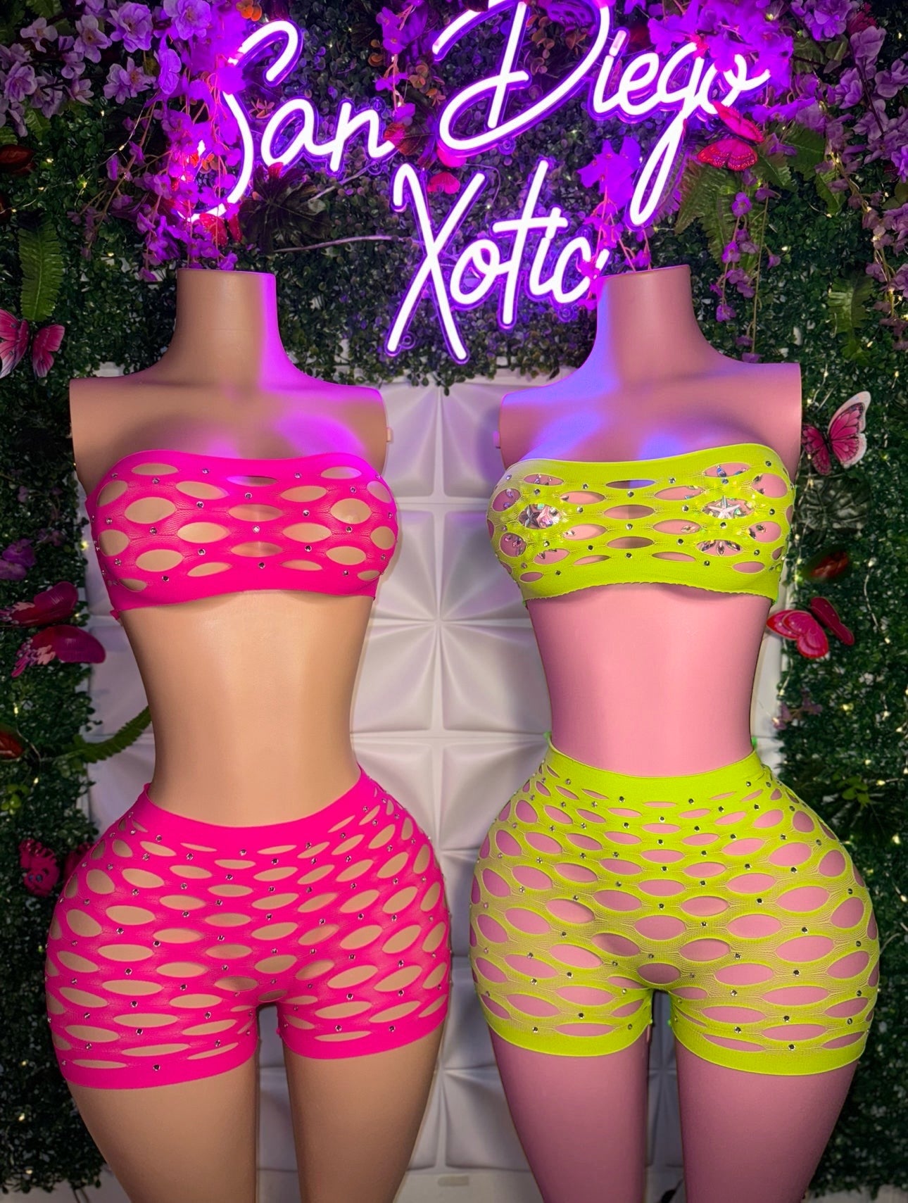 My Type Rhinestone Fishnet Shorts Set Fits XS-L
