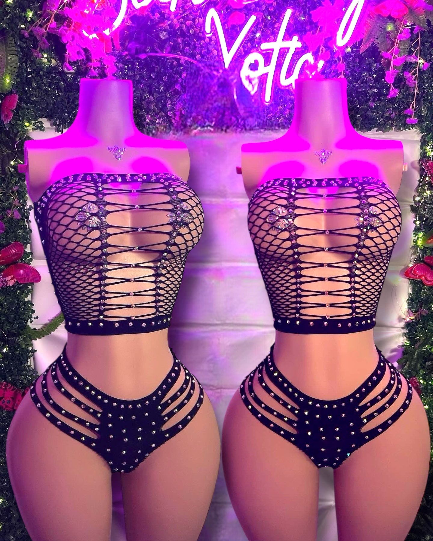Natina Extra Rhinestone 2 Piece Cheeky Fishnet Set Fits All