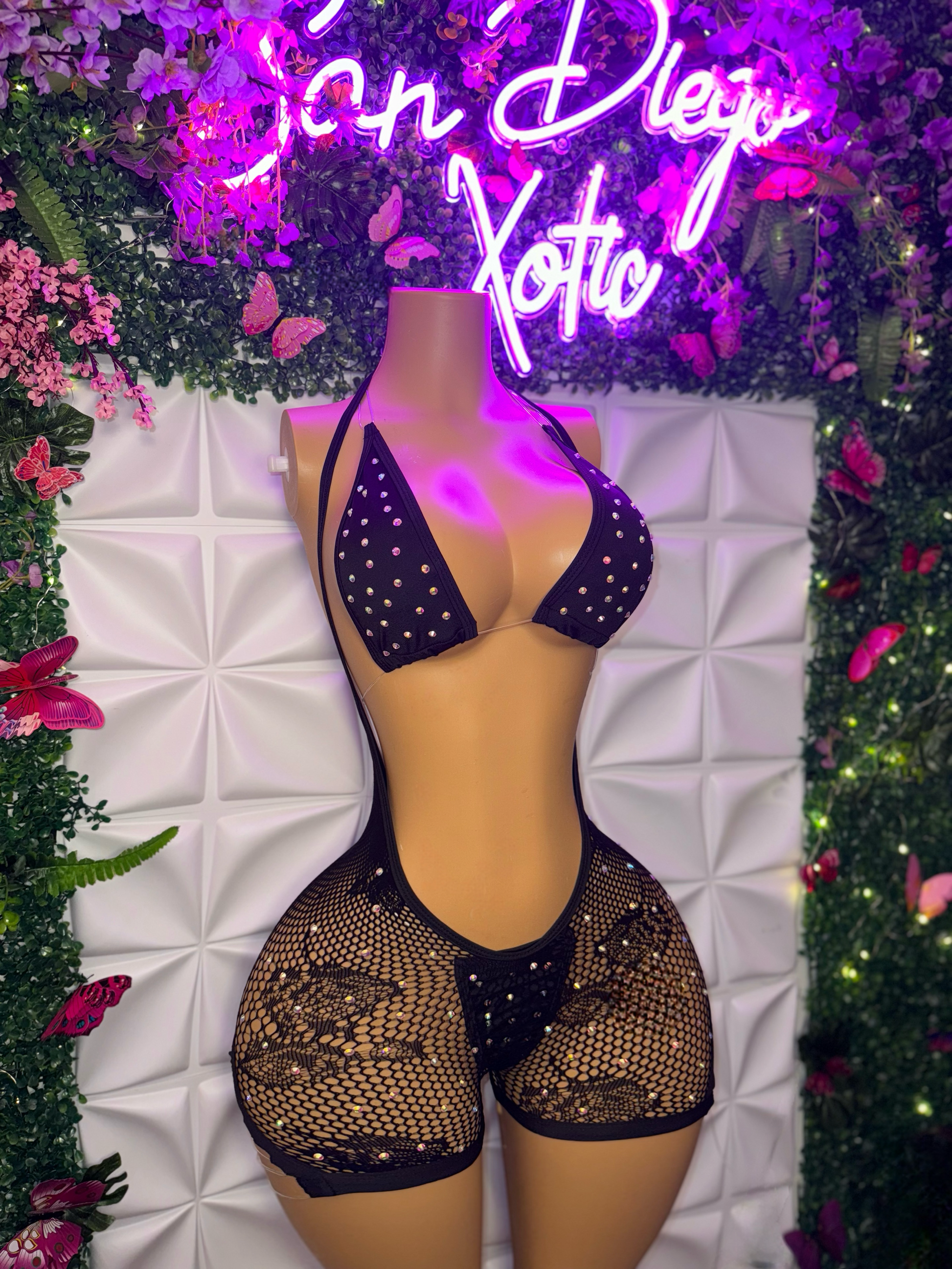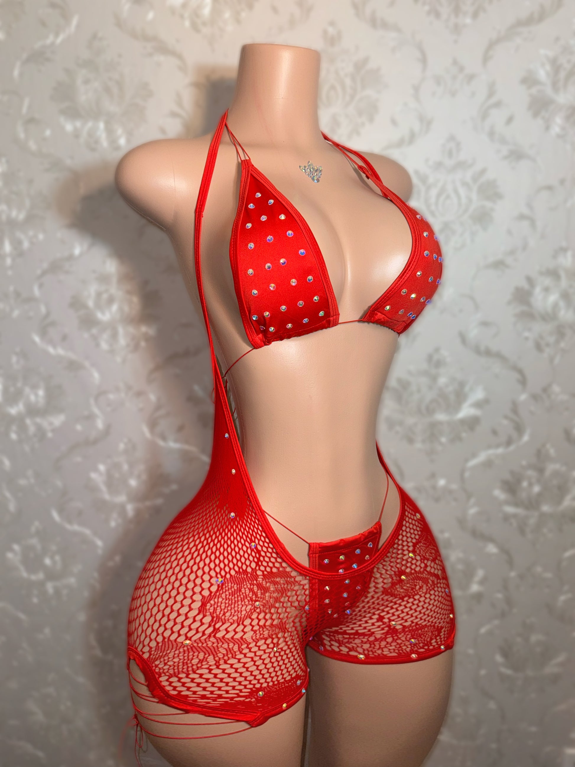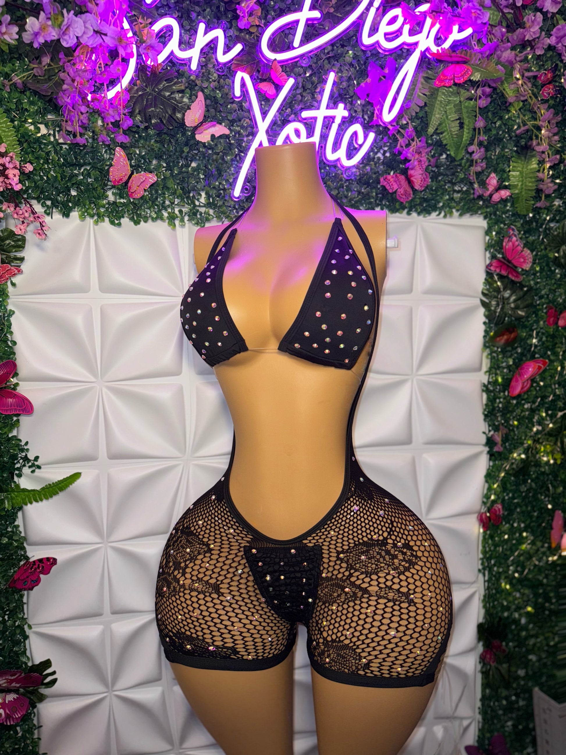 Plain Jane Fishnet Overalls and Bikini with Extra Rhinestones 3 Piece Set Fits XS-L