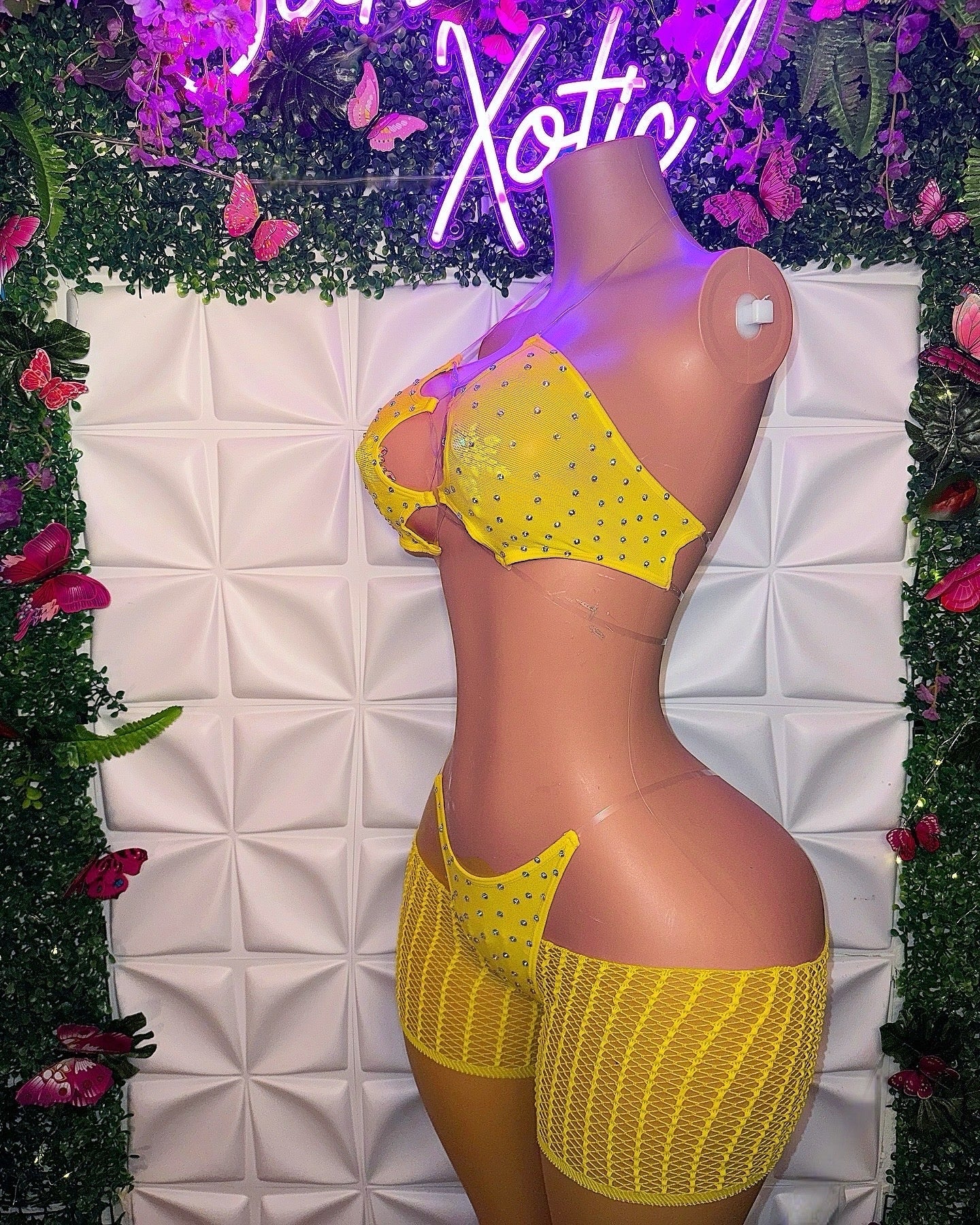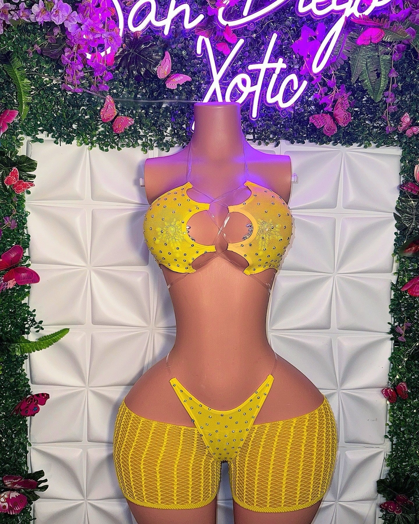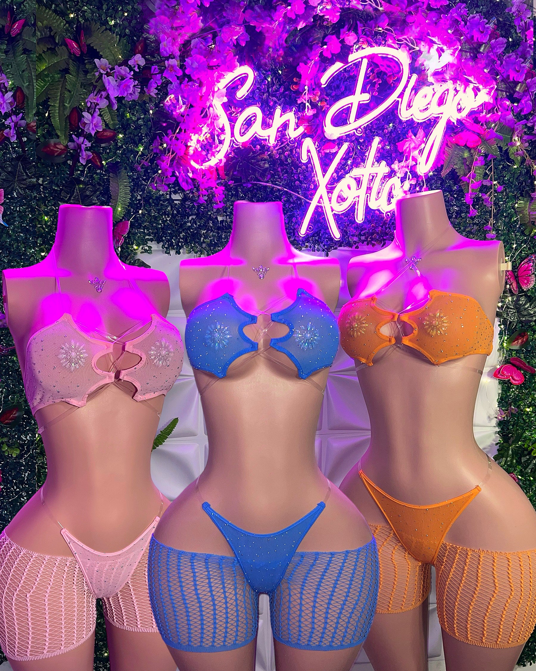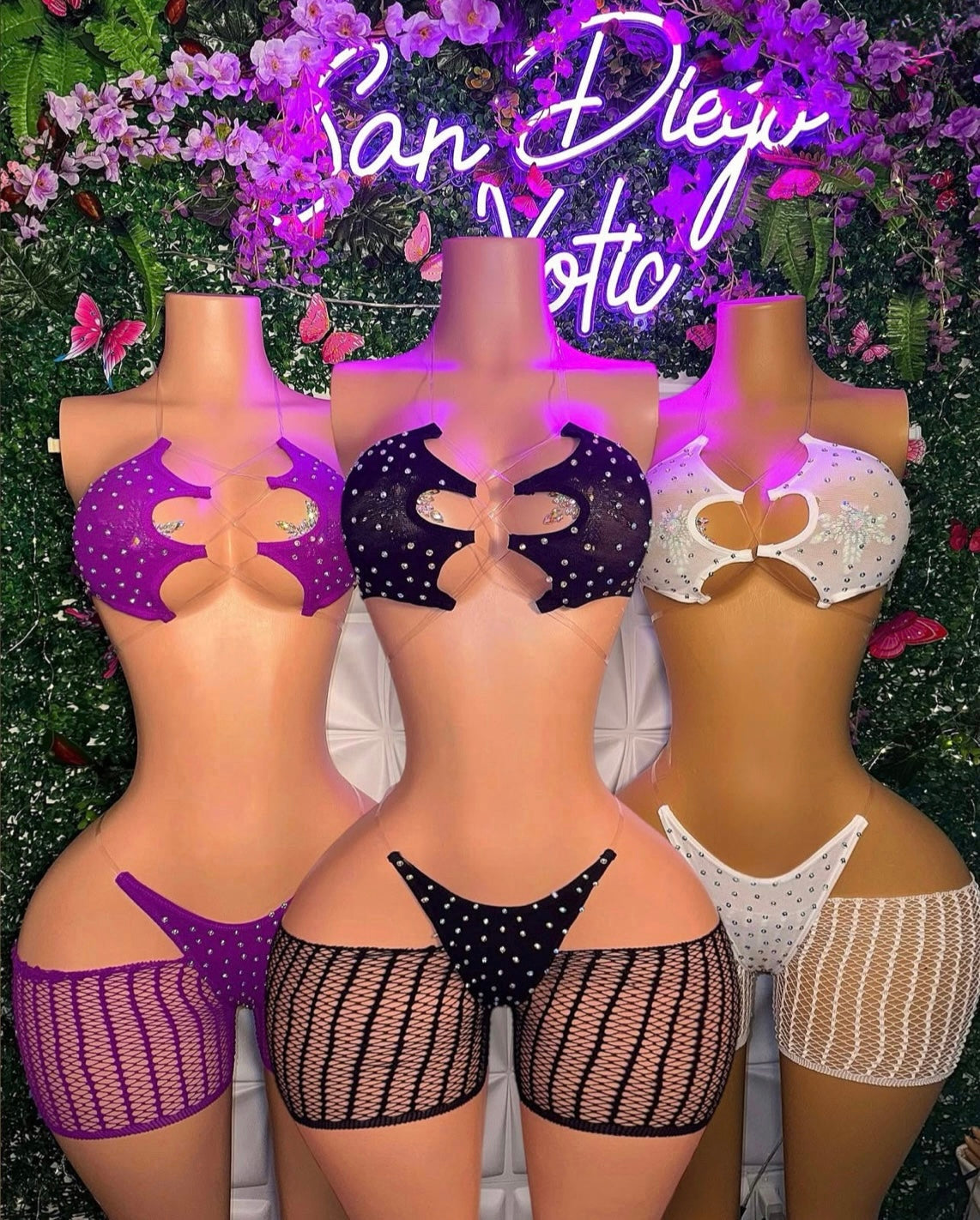 Riyah 3 Piece Set Rhinestone Mesh Kini with Cut-Off Fishnets Fits S-XL