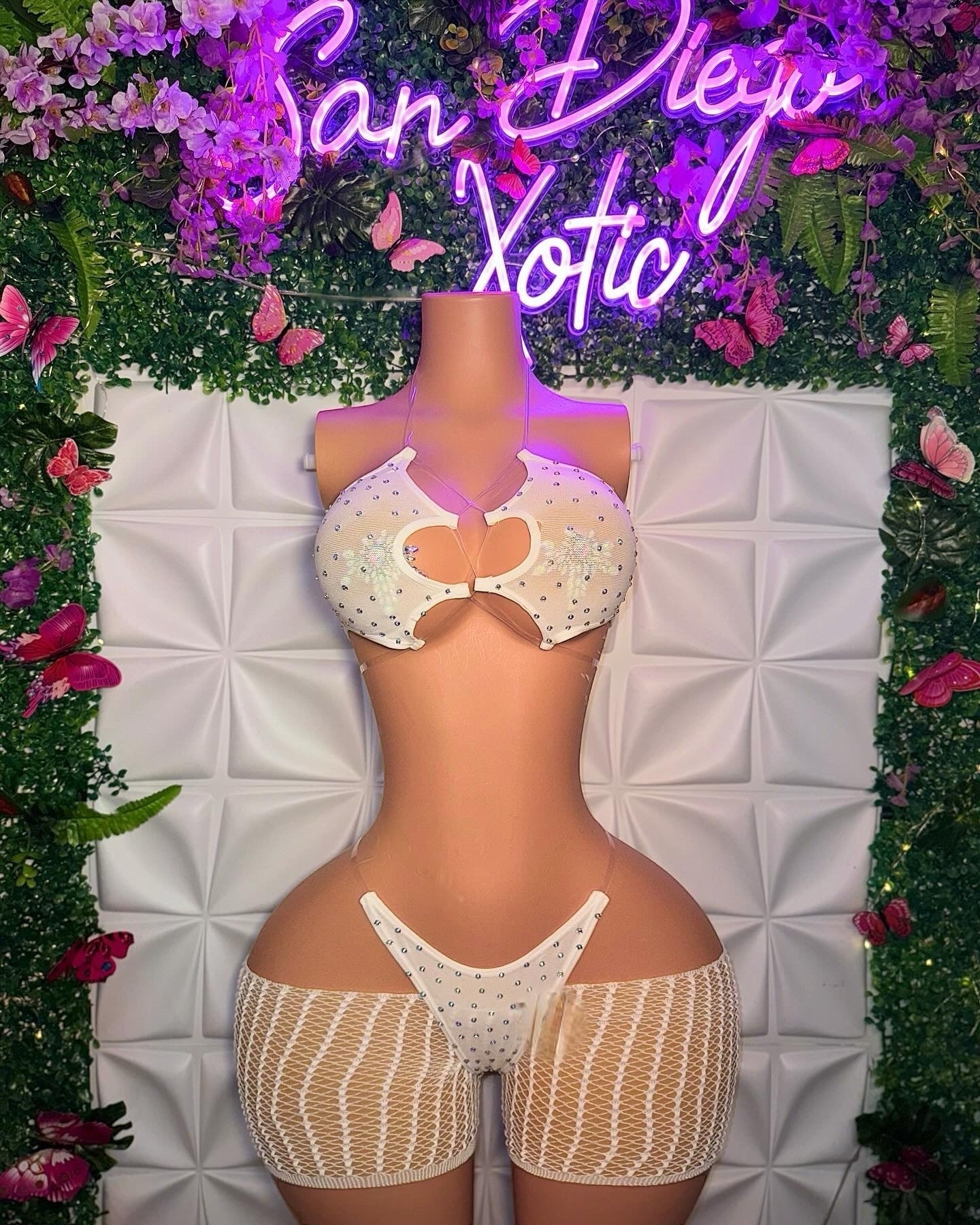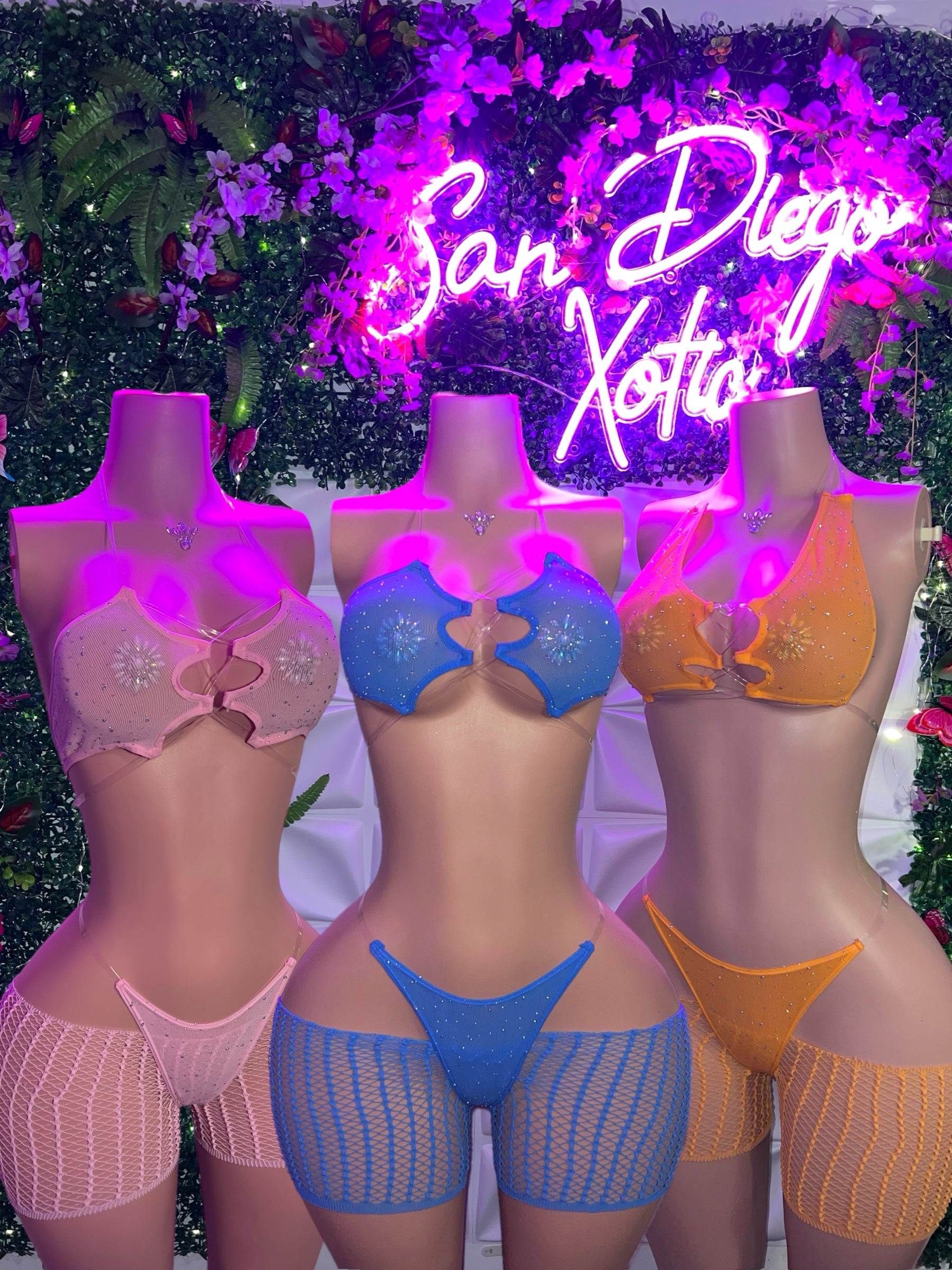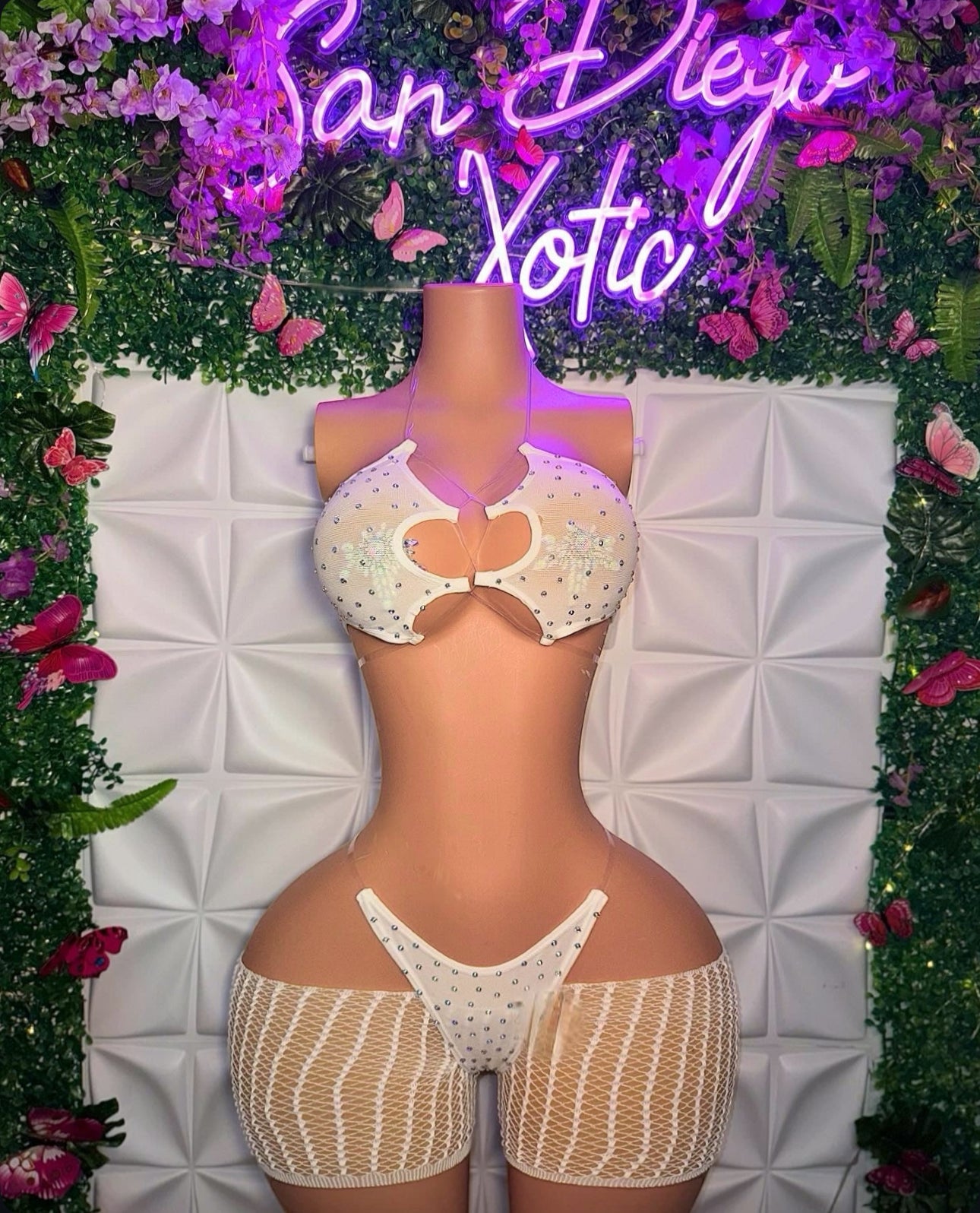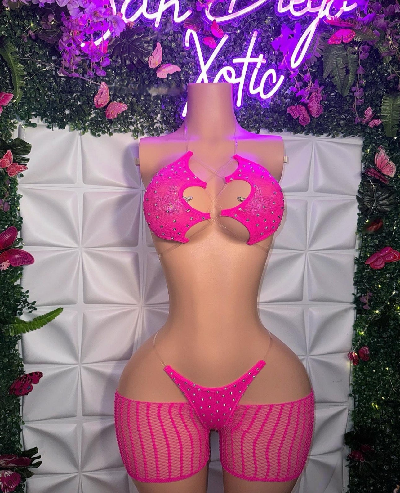 Riyah 3 Piece Set Rhinestone Mesh Kini with Cut-Off Fishnets Fits S-XL