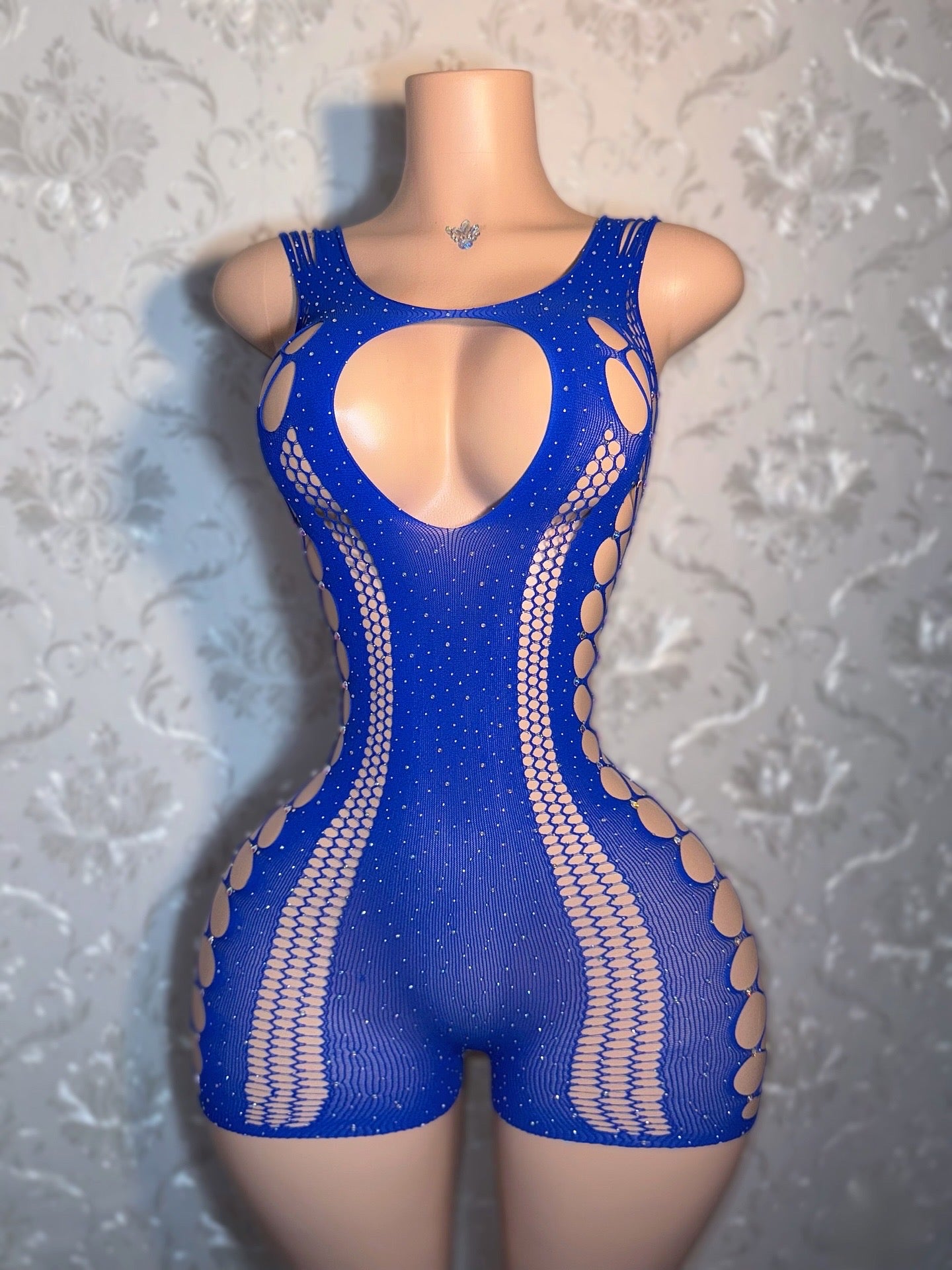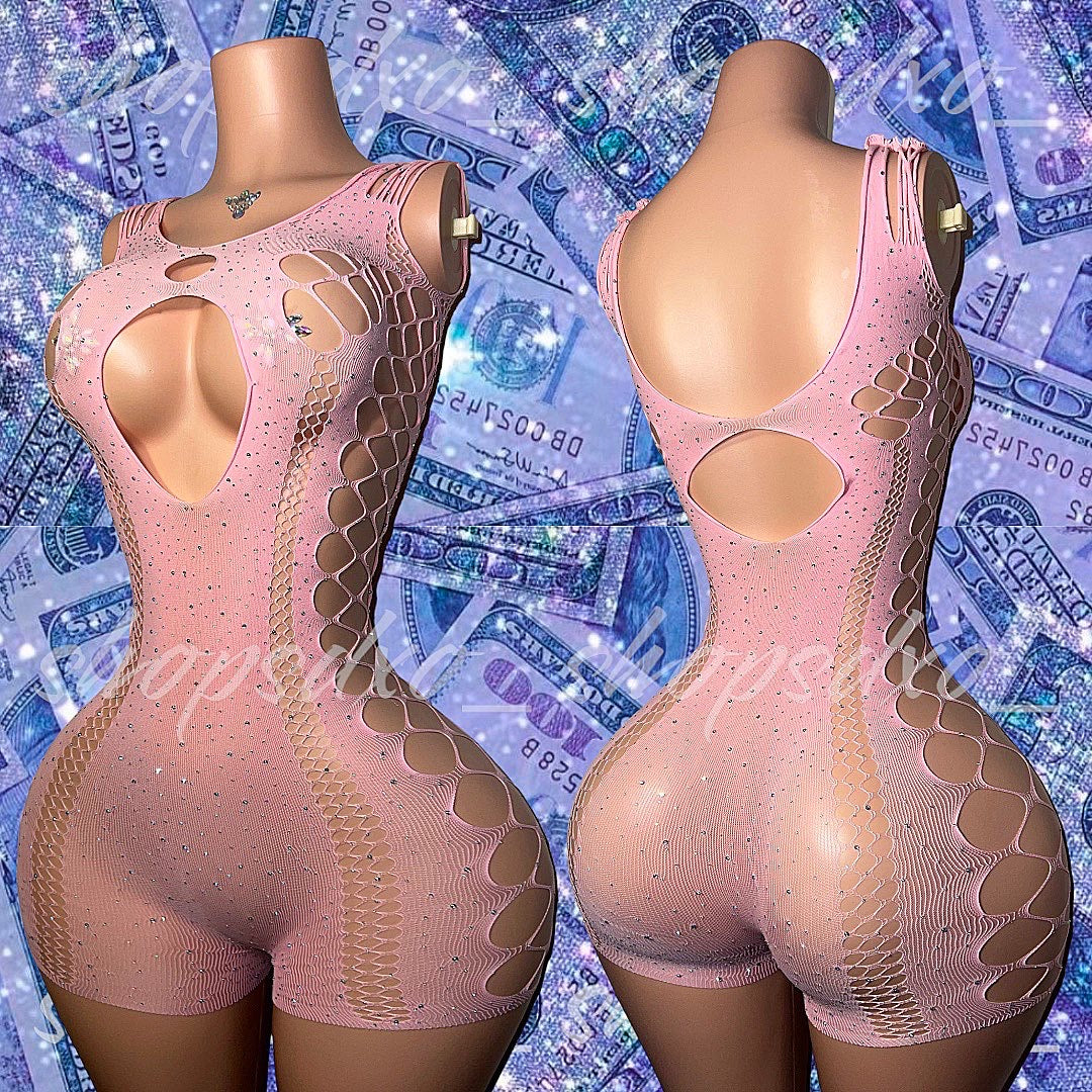 Tracie Bedazzled Crop Tee Romper Baby Tee Fishnet Romper Fits XS-XL