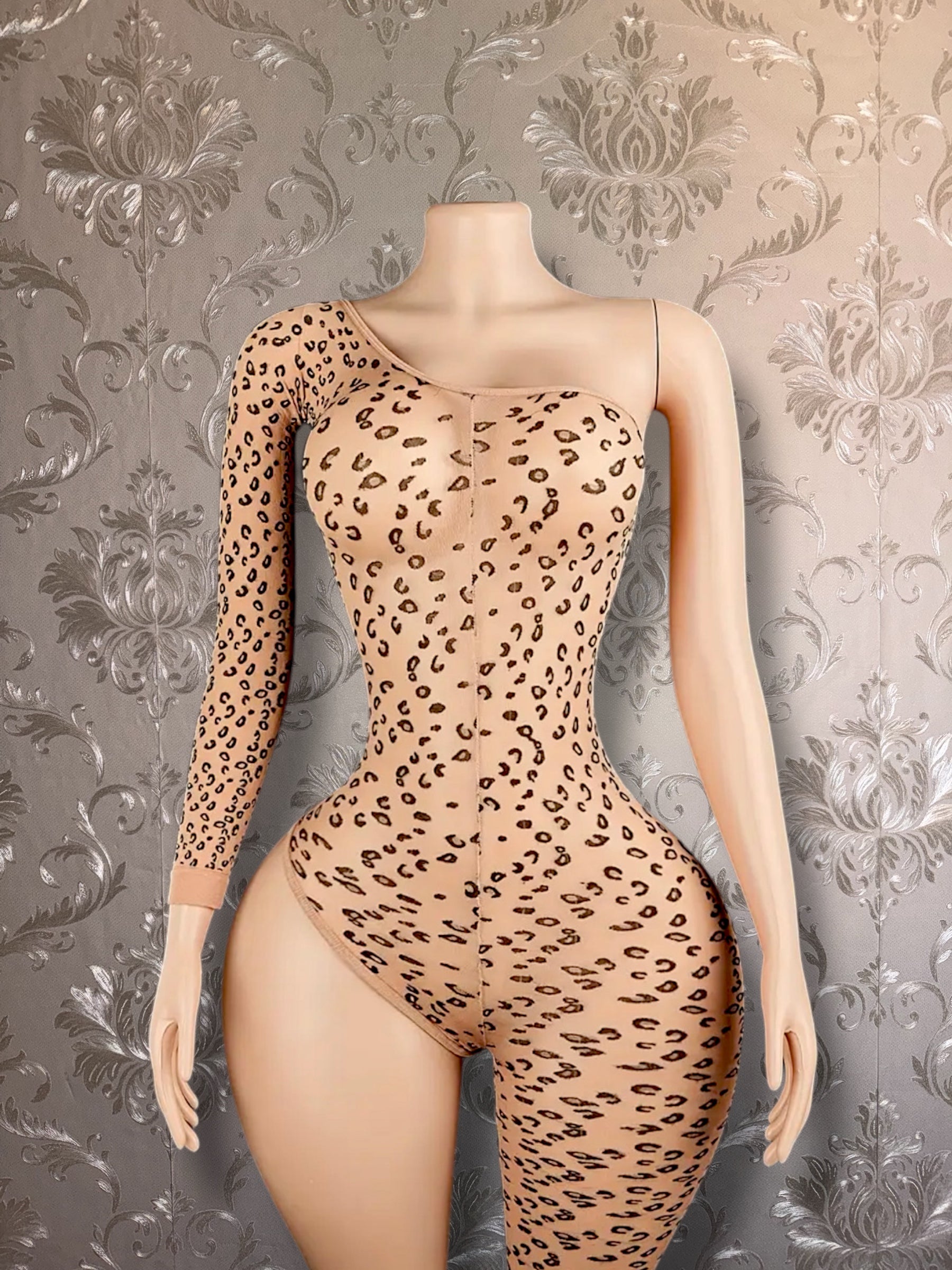 Leopard Asymmetrical Bodystocking Nude Mesh