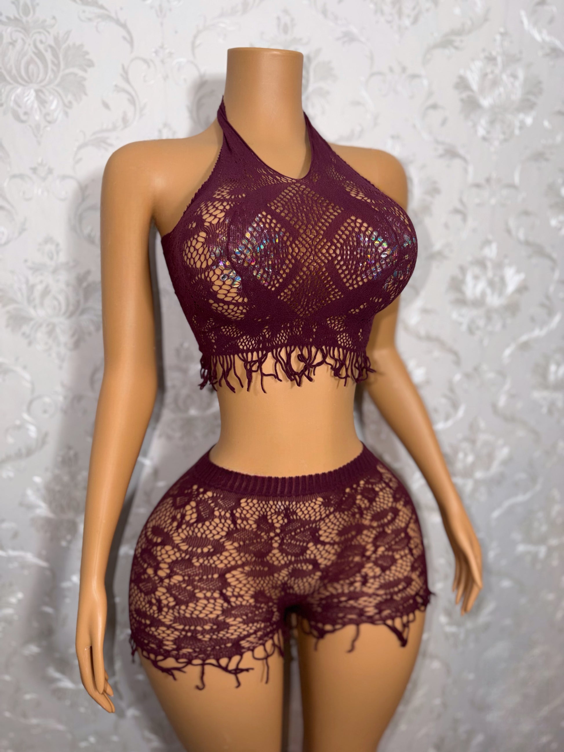 Amber Fringe Fishnet Shorts Set In Currant