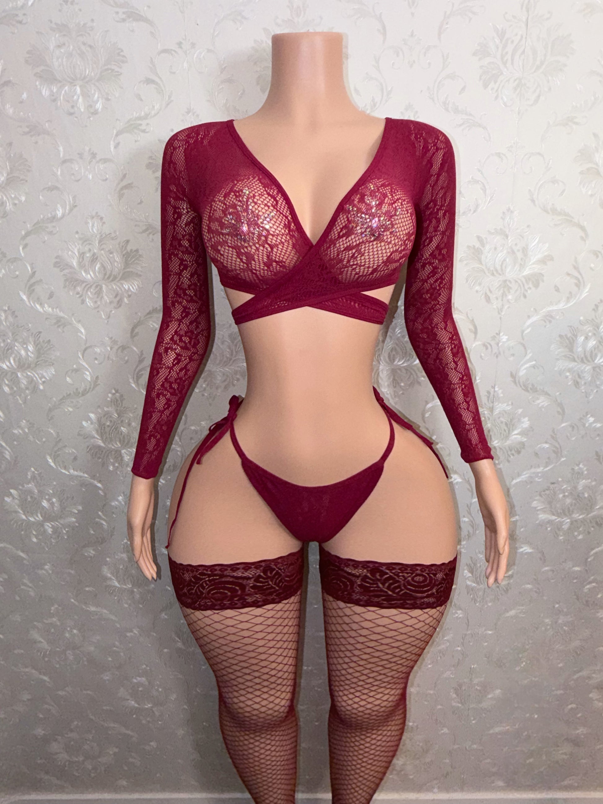 Venus Burgundy 3 Piece With Lace Thigh High Stockings Fits S-XXL